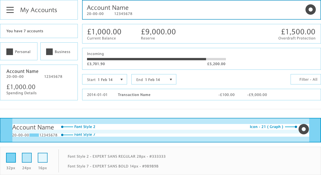 With over 32 user journeys starting from the main navigation alone, the app always risked feeling bloated & overwhelming. Adding in the dual personal/business functionality, the fact that a majority of our users had multiple checking/banking/savings accounts, mortgages & even loans, we had to be very careful to highlight the top services offered while not burying the less used but still important features