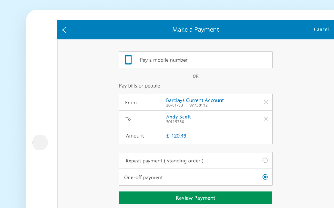 Being a banking app, one of our biggest features was - you guessed it - making payments. We allowed users to pay from any of their various accounts to pre-existing contacts, new contacts, or users by cell number ( if they banked with Barclays ). We also allowed them to set up and make recurring payments for spending such as monthly bills