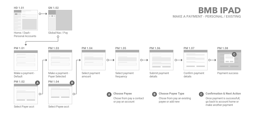 Mapping out user journeys helped us figure out what screens would need to be built, and what the different success / error scenarious would be before we starting building out low fidelity wires