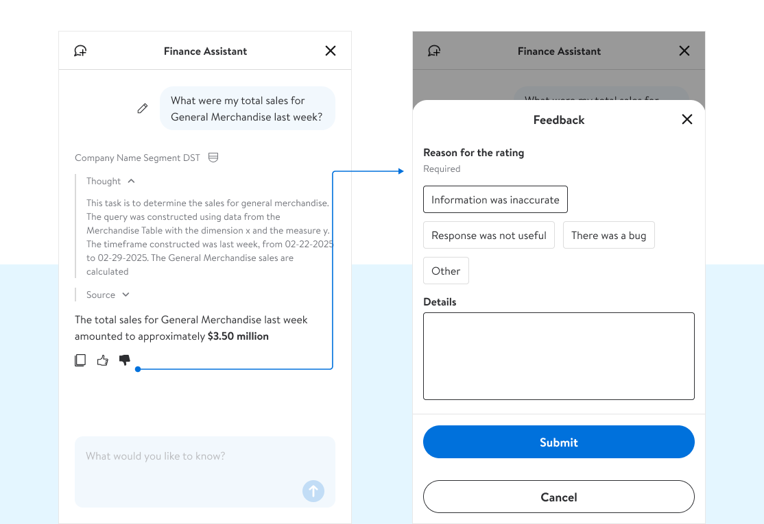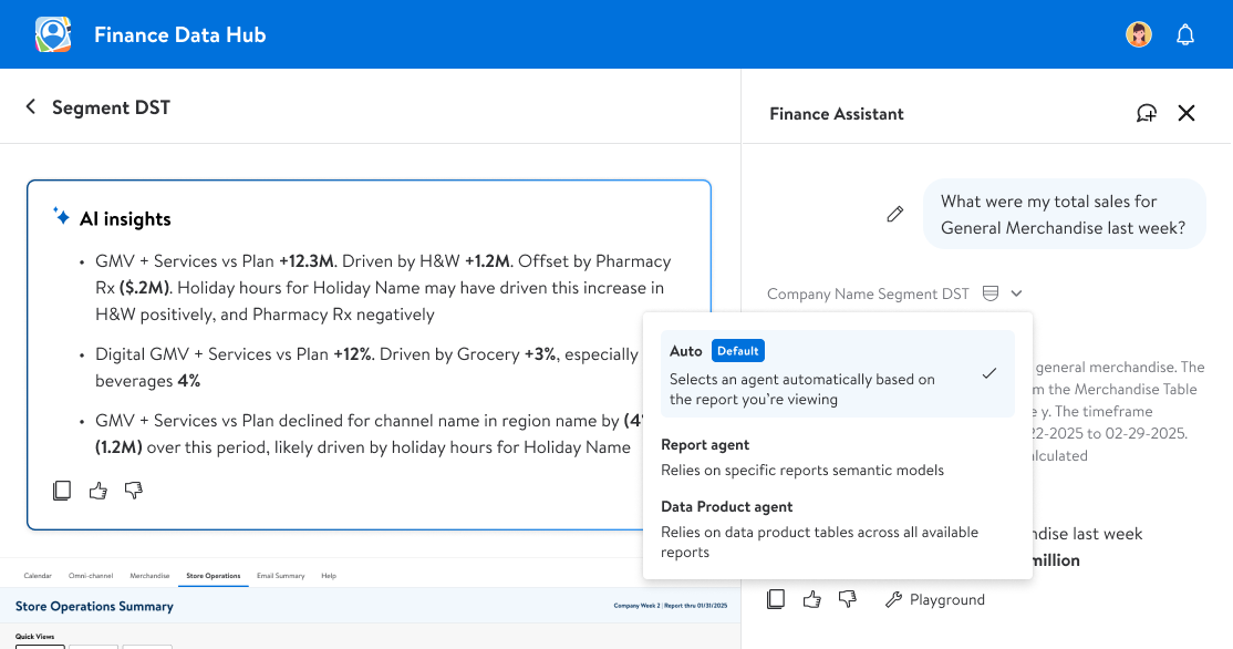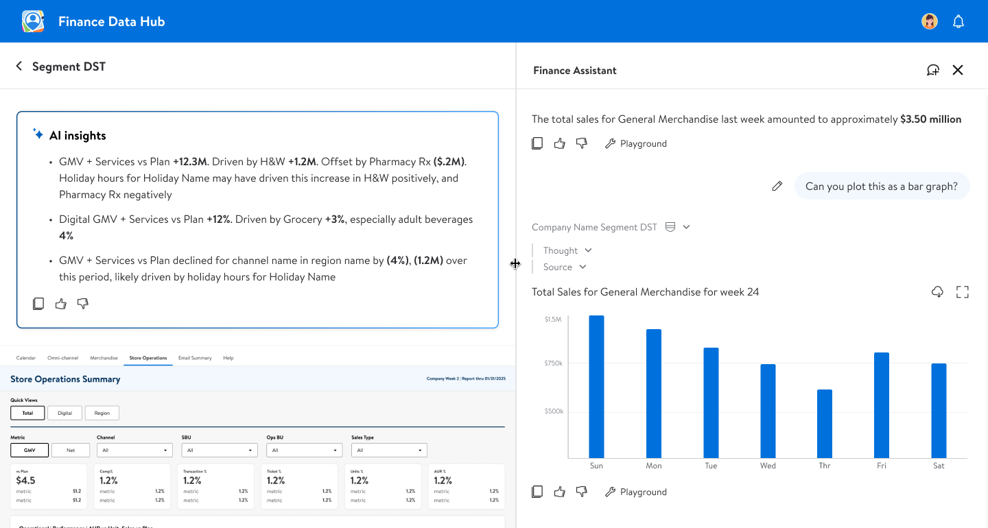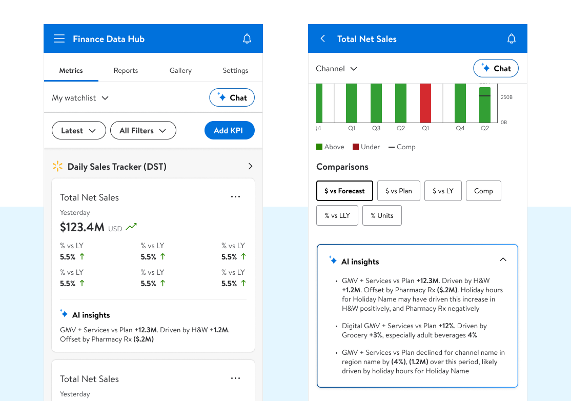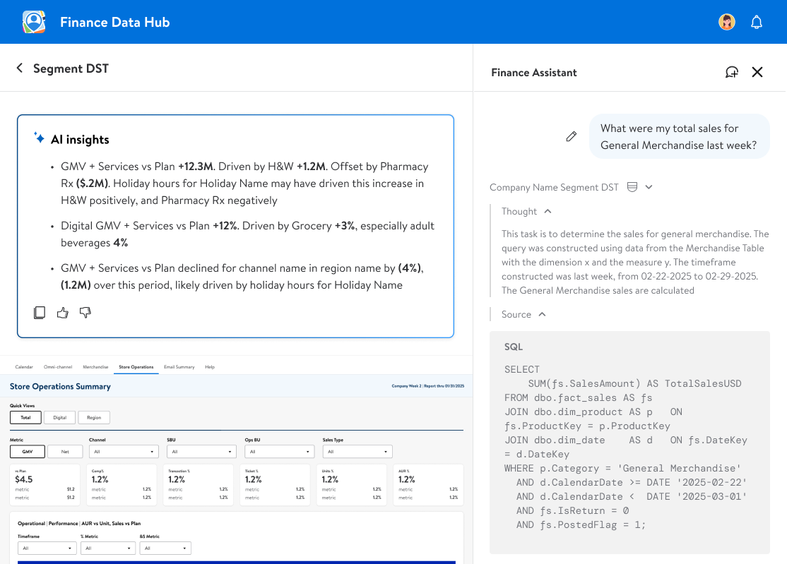 The goal was to be intentional — to design an assistant that actually helped analysts and leadership get answers faster, not just chase the hype. That meant building Finance Assistant, a chat agent trained on individual reports, and AI Insights, which surfaced explanations inside KPI cards and inside our drill down and wider report level views