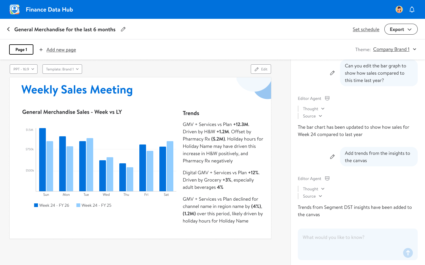 Building off the data viz creation, we started to build out a 'Canvas' area where users could save/edit elements they had created into a powerpoint template - they could requery the agent to adjust data inputs, add a narative and even save a template and run it against a cadence