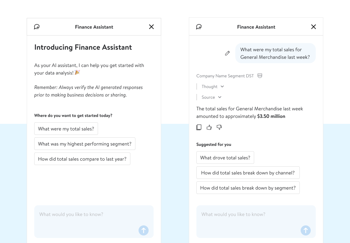 Chat quickly surfaced as a must-have feature — pushed equally hard by both users and business leadership. Early testing showed that users didn't always know how to approach it at first, so we built out report driven prompts to help start engagment and encourage training thru interaction